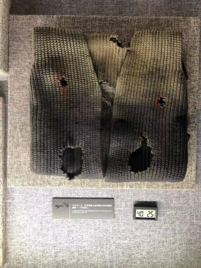 这件色泽灰暗的羊毛背心是一件十分重要的国家一级文物。背心上有7处弹孔、斑驳的血迹触目惊心,参观者无不为之动容。